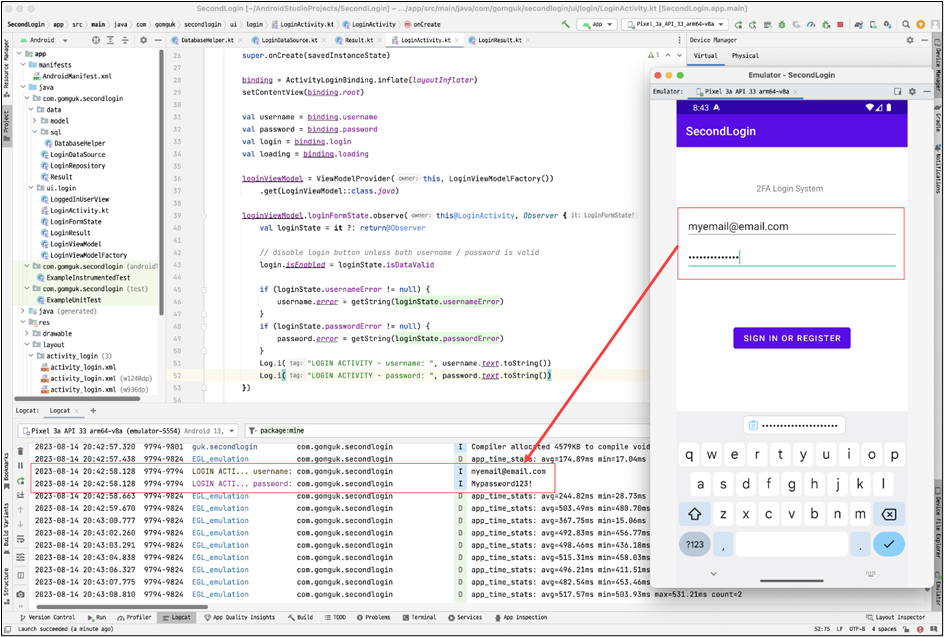 로그인 액티비티에서 입력 폼에 값을 입력하여 폼의 상태(State)가 변경될 때마다 디버그 로그를 출력하도록 한 코드이다.개발자는 입출력 처리 로직을 구성할 때 데이터가 잘 처리되는지 여부를 확인할 목적으로 위와 같이 디버그 로그를 구성할 수 있다.