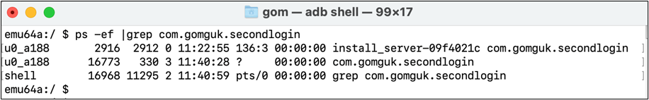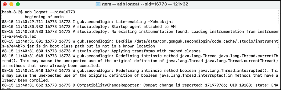 ADB명령으로 로그캣 실행을 통해 디버그 로그를 확인할 수 있다.먼저, adb shell로 단말에 접속하여 실행중인 앱의PID(Process ID)를 식별한다.