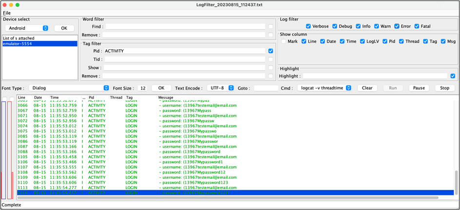 로그 필터 실행 후 연결된 단말 또는 에뮬레이터 선택 후 필터링할 단어,로그레벨, PID등을 선택 후‘Start’를 통해 로그를 수집한다.수집한 로그는 로그필터를 실행한 경로 내 텍스트 파일(txt)로 저장되어 실행이후에도 다시 분석할 수 있다.위와 같이 사용자 입력 내용이 디버그 로그에 남을 경우,사용자의 행동 패턴이나 민감한 데이터가 노출될 수 있다.
