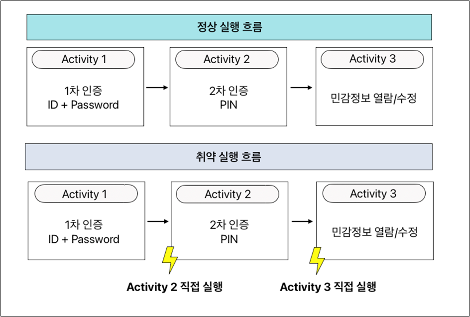 앱 개발자는 사용자의 민감정보나 중요 기능에 접근하기 전 인증 기능을 거치도록 앱을 구성할 수 있다. 그러나 액티비티에 대한 보안 설정을 취약하게 설정하여 외부로 노출된 경우, 각각의 액티비티를 실행 흐름에 관계없이 호출할 수 있다. 예를 들어 기존의 사용자 로그인 정보가 앱 내에 저장되어 있고, 두 번째 액티비티의 강제 실행을 통해 1차 인증을 우회하고 2차 인증만 통과하면 세 번째 액티비티의 민감정보에 접근할 수 있다. 세 번째 액티비티의 강제 실행이 가능한 경우, 앞의 두 단계에 대한 인증 로직을 우회하여 실행할 수 있다.