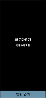 앱 실행 시 “아로마요가” 메시지와 하단의 “앨범 열기” 버튼을 확인할 수 있다. “앨범 열기” 버튼을 터치하면 사용자에게 시스템 접근 권한을 요청한다.