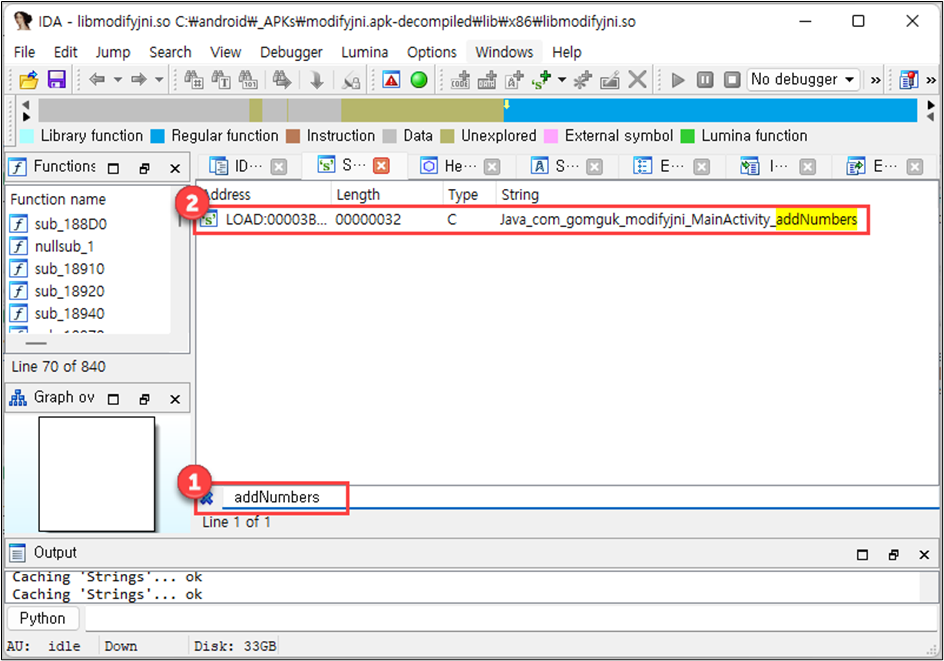 네이티브 코드 분석을 위해 라이브러리 폴더(lib) 하위의 아키텍처를 선택한 후 공유 오브젝트(so) 파일을 분석한다. 실습에서는 x86을 기준으로 설명한다. IDA로 파일을 열고 문자열 검색 기능을 이용하여 함수의 이름을 검색하면 함수의 주소로 바로 접근할 수 있다.