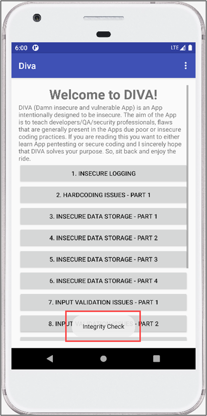 Toast.makeText(getApplicationContext(), "Integrity Check", Toast.LENGTH_LONG).show();