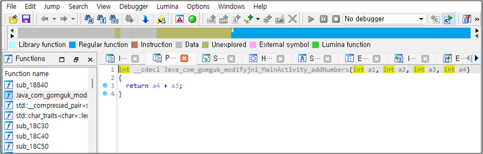 앱에서 네이티브로 작성된 라이브러리를 호출하고 있음을 확인할 수 있고 이를 통해 분석할 지점이 추가로 있음을 확인한다. 액티비티 내에 네이티브 함수와 상호작용하고 있는 코드가 있는지 추가로 분석한다. 실습 코드에서는 public final native int addNumbers(int i, int i2);와 public final native String stringFromJNI();코드가 네이티브 코드로 작성된 함수와 상호작용하고 있다. 선언한 함수는 자바 코드에서 선언한 함수와 동일하게 함수명과 인자를 전달하여 호출할 수 있다.