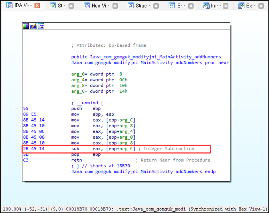 동기화를 선택하면 IDA의 헥스 뷰(hex view) 탭과 어셈블리 코드의 영역이 파일의 바이트 코드 오프셋과 일치하게 되며 위치를 쉽게 확인할 수 있다. 덧셈 명령어(add)를 뺄셈 명령어(sub)로 변경하기 위해서 바이트 코드를 0x03에서 0x2B로 수정한다. 바이트 코드를 수정하기 위해 IDA에서 03 앞에서 마우스를 클릭하고, 키보드의 ‘F2’ 키를 눌러 수정 모드로 변경한다. 커서의 모양이 바뀌고 키보드에 입력하는 바이트 코드가 즉시 입력된다. 2B를 입력한다. 수정이 완료된 후에는 다시 ‘F2’를 눌러 바이트 코드 수정을 종료한다. 수정 후의 헥스 뷰와 어셈블리 코드 영역에서 확인한 결과는 다음과 같다.