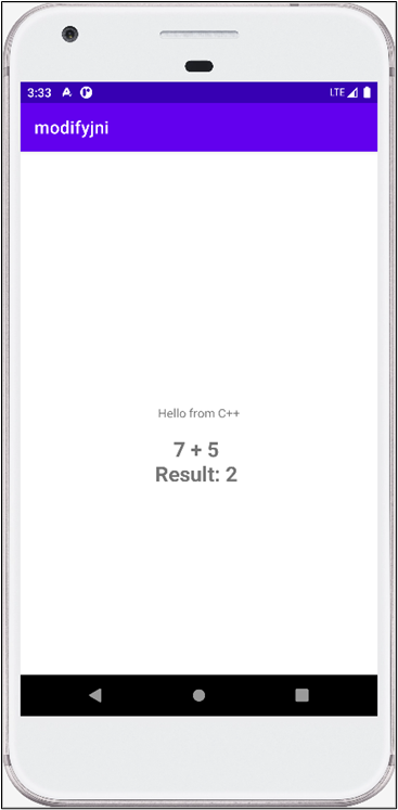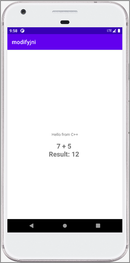 앱을 빌드하고 APK 파일을 설치 후 실행하면 텍스트 위젯으로 바인딩한 JNI 함수의 실행 결과가 출력되는 것을 확인할 수 있다. 자바에서 7과 5의 두 개의 정수를 함수의 인자로 전달하였고, 네이티브 함수에서 덧셈을 수행하여 결과를 반환한다.