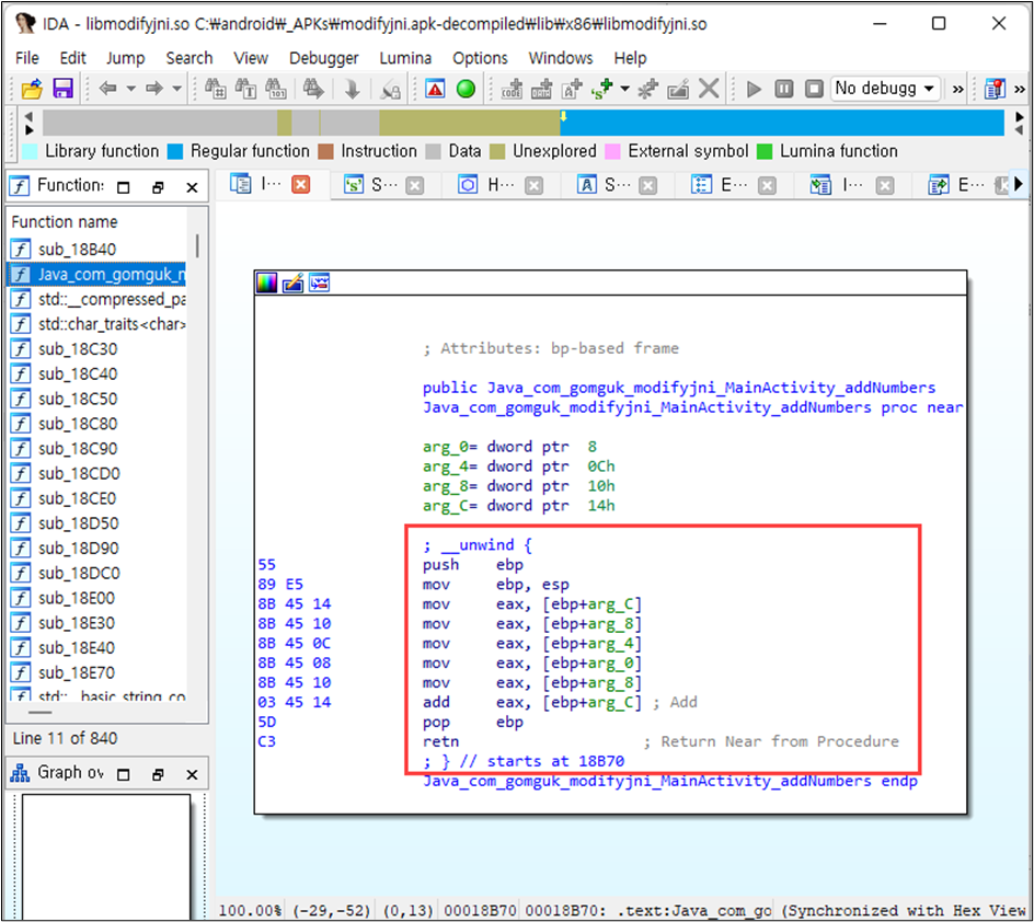 네이티브 코드 분석을 위해 라이브러리 폴더(lib) 하위의 아키텍처를 선택한 후 공유 오브젝트(so) 파일을 분석한다. 실습에서는 x86을 기준으로 설명한다. IDA로 파일을 열고 문자열 검색 기능을 이용하여 함수의 이름을 검색하면 함수의 주소로 바로 접근할 수 있다.