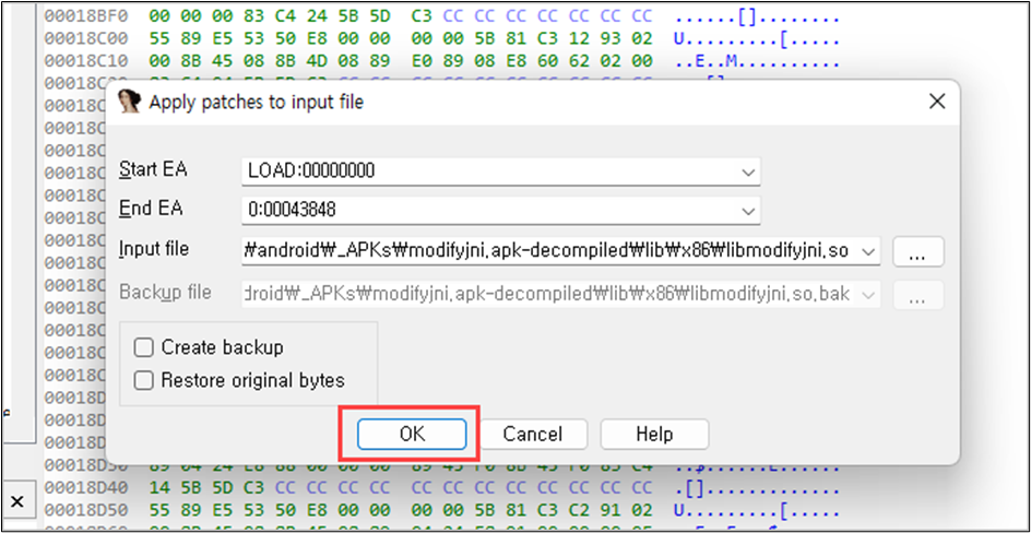 올바르게 코드 수정이 되었음을 확인한 후에는 변경된 코드를 바이너리에 반영해야 한다. IDA에서는 수정(edit) → 프로그램 수정(patch program) → 원본 파일에 패치내용 적용(apply patches to input file) 순서로 접근하여 대화상자를 연 후에 기본설정으로 된 주소 영역(프로그램 주소 처음부터 끝)에 대해 수정한 내용을 적용한다.