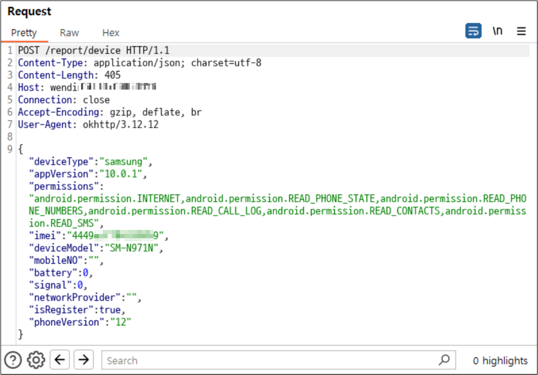 수집한 정보는 공격자의 서버로 전송한다. 단말 정보를 저장하는 공격자의 서버 경로(‘/report/device’)를 확인한다