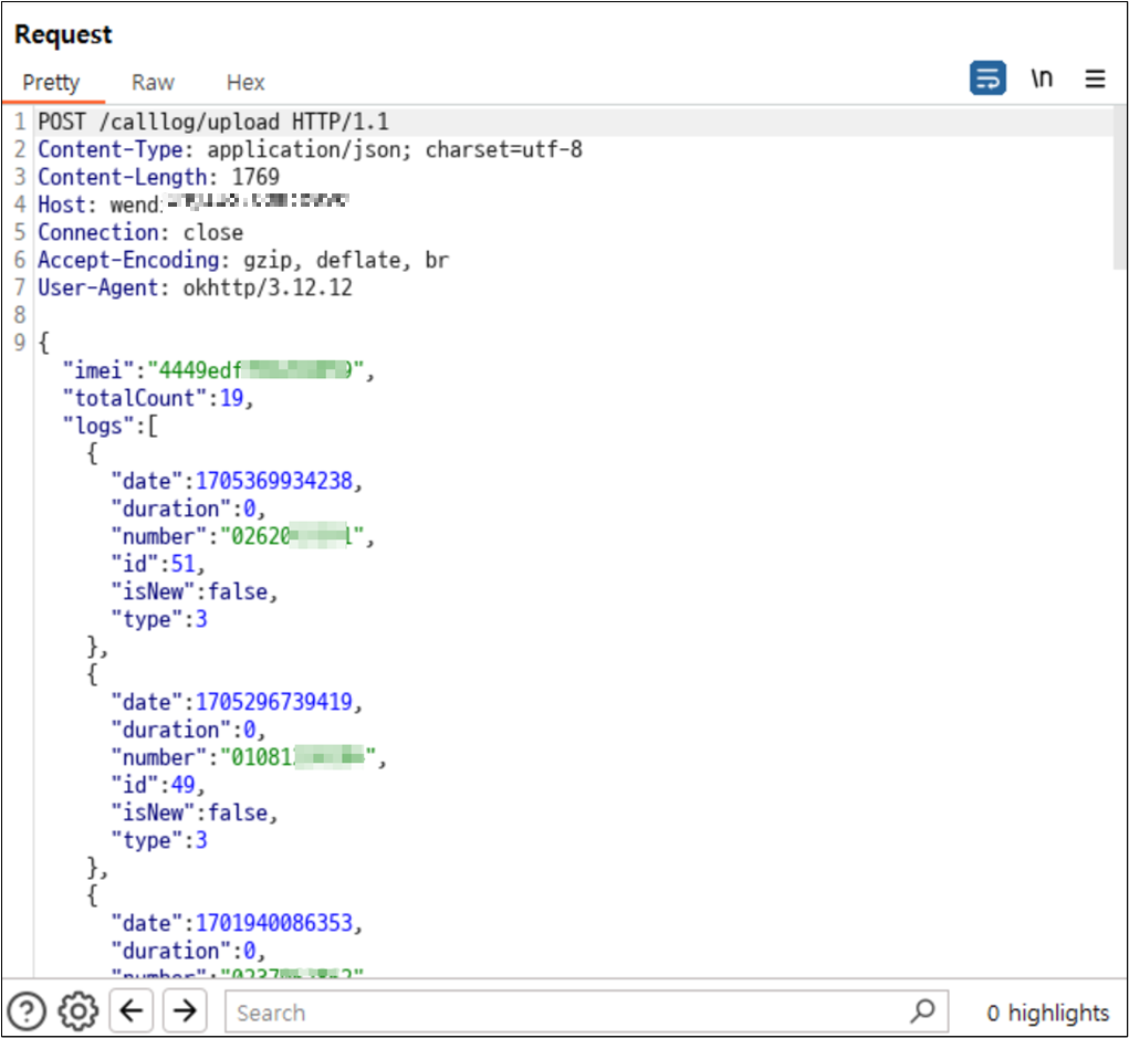 단말의 통화기록에 접근하여 ‘imei’, ‘전체 통화 목록 개수’, ‘통화기록(통화시간, 일시, 번호, 수발신 여부)’ 등 데이터를 수집한다.