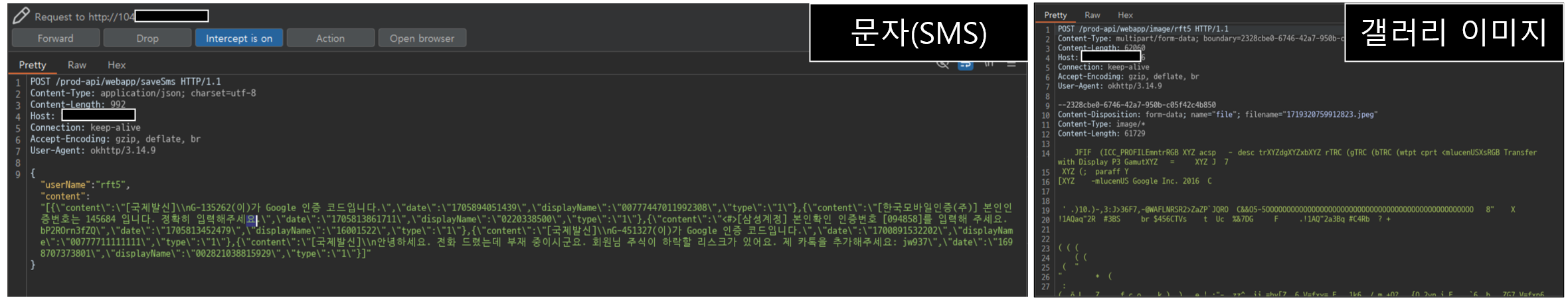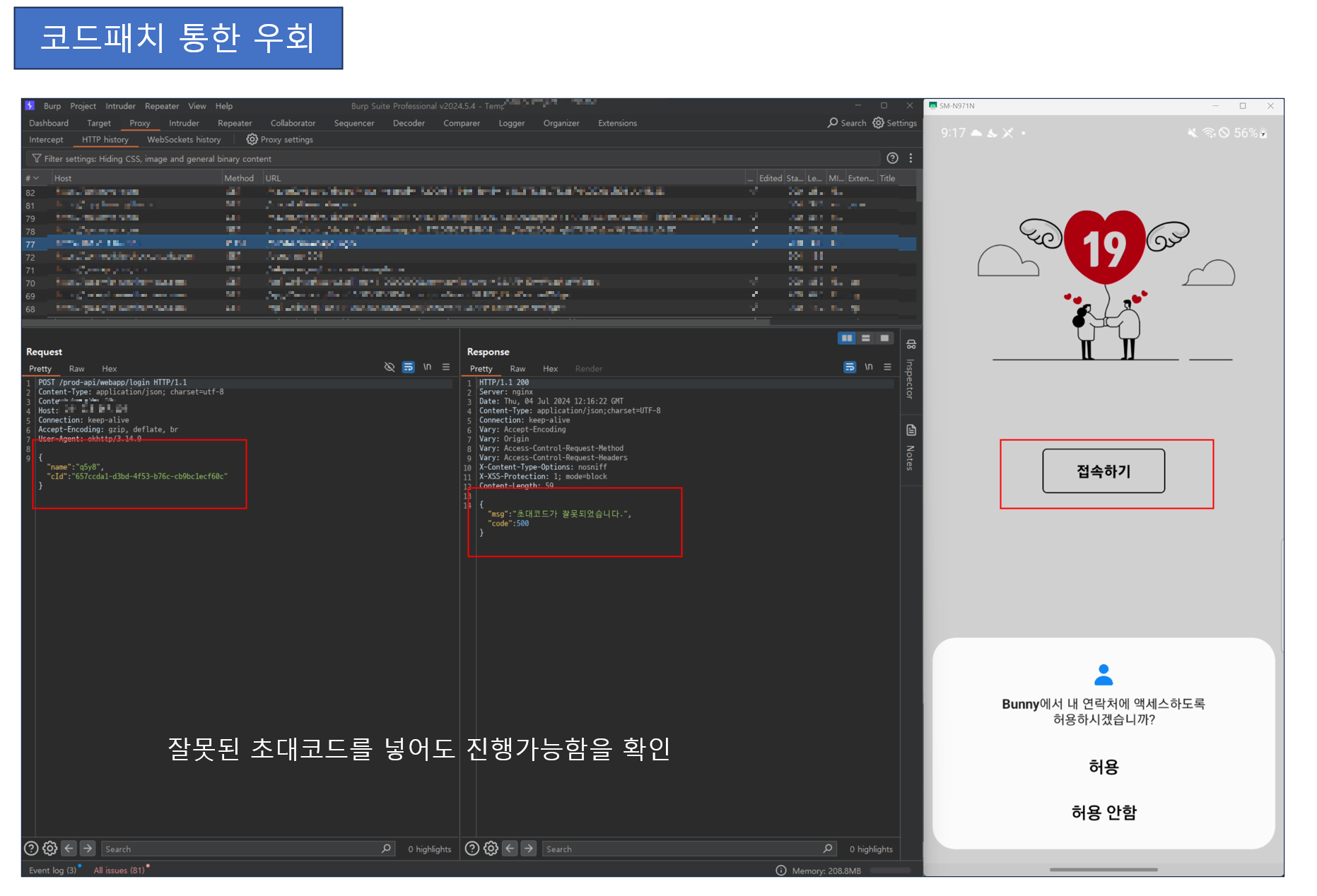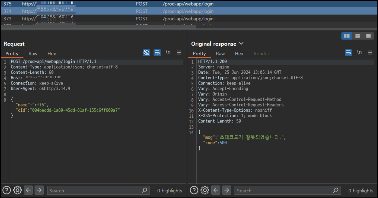 임의로 초대코드를 입력하고 프록시 도구를 이용하여 응답을 확인하면, 실제로 공격자의 서버로 초대코드가 전송되며 서버에서 검증하고 있는 것을 확인할 수 있다. 초대코드의 정합성 여부를 서버에서 검증하고, HTTP 응답을 받아 앱이 다음 동작을 정의하는 구조일 것으로 예상할 수 있다.