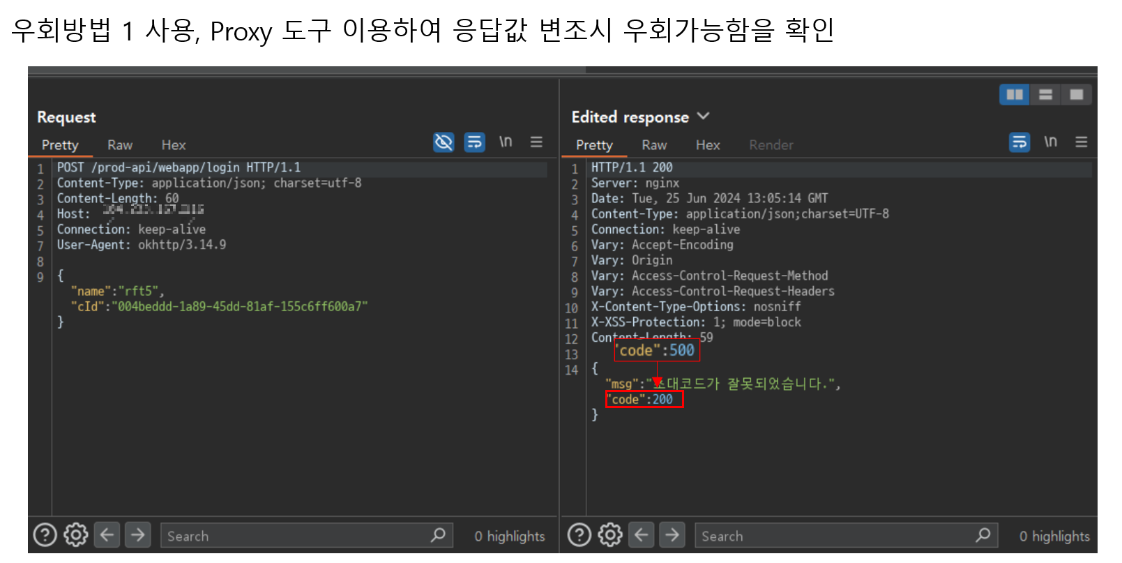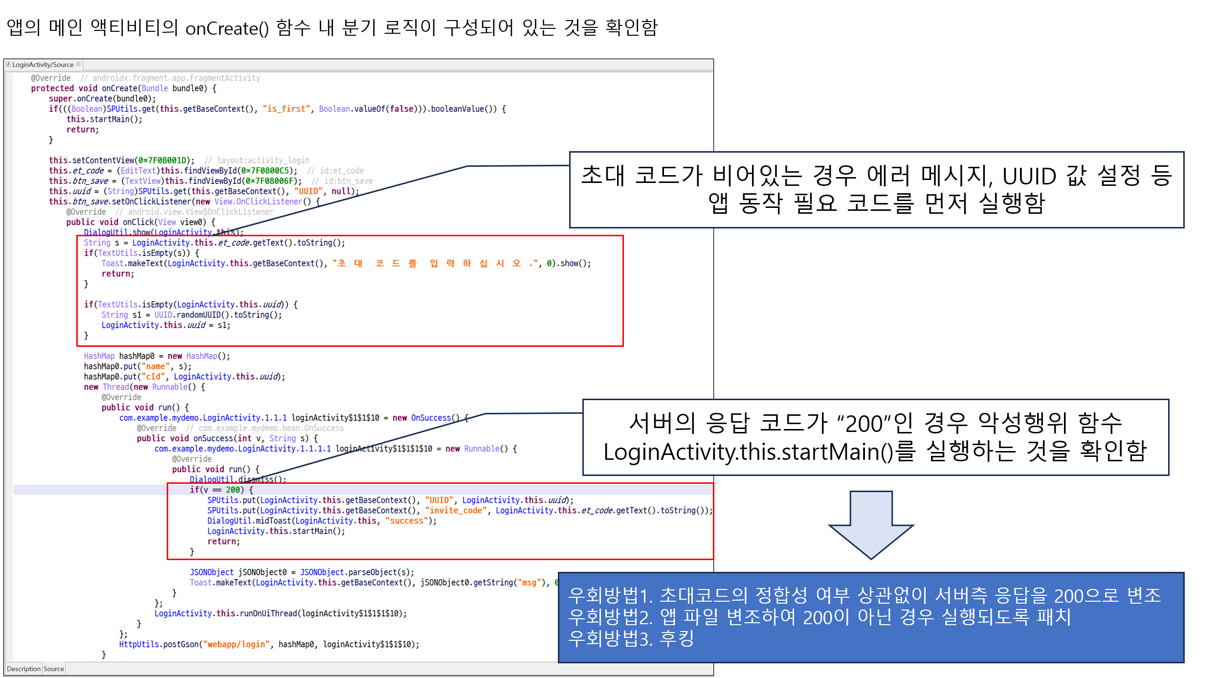 HTTP 응답 코드에 따라 앱의 다음 동작 로직 실행 여부를 결정하고 있다. 200인 경우 정상 응답, 500인 경우 초대코드가 잘못된 것으로 판단하고 있다. 동시에 우회할 방법을 여러가지 생각할 수 있다. 프록시 도구를 통해 앱 패킷을 조작할 수 있는 경우 응답을 200으로 변경하면 될 것이고, 앱 파일을 코드패치하여 응답 코드가 200이 아닌 경우에도 실행되도록 할 수 있다. 또한 후킹을 이용하여 관련 함수가 실행될 때 인자를 바꾸는 방법도 고려해볼 수 있겠다. 제시한 방법 이외에도 다양한 방법이 있으니 상황에 맞게 적용한다.