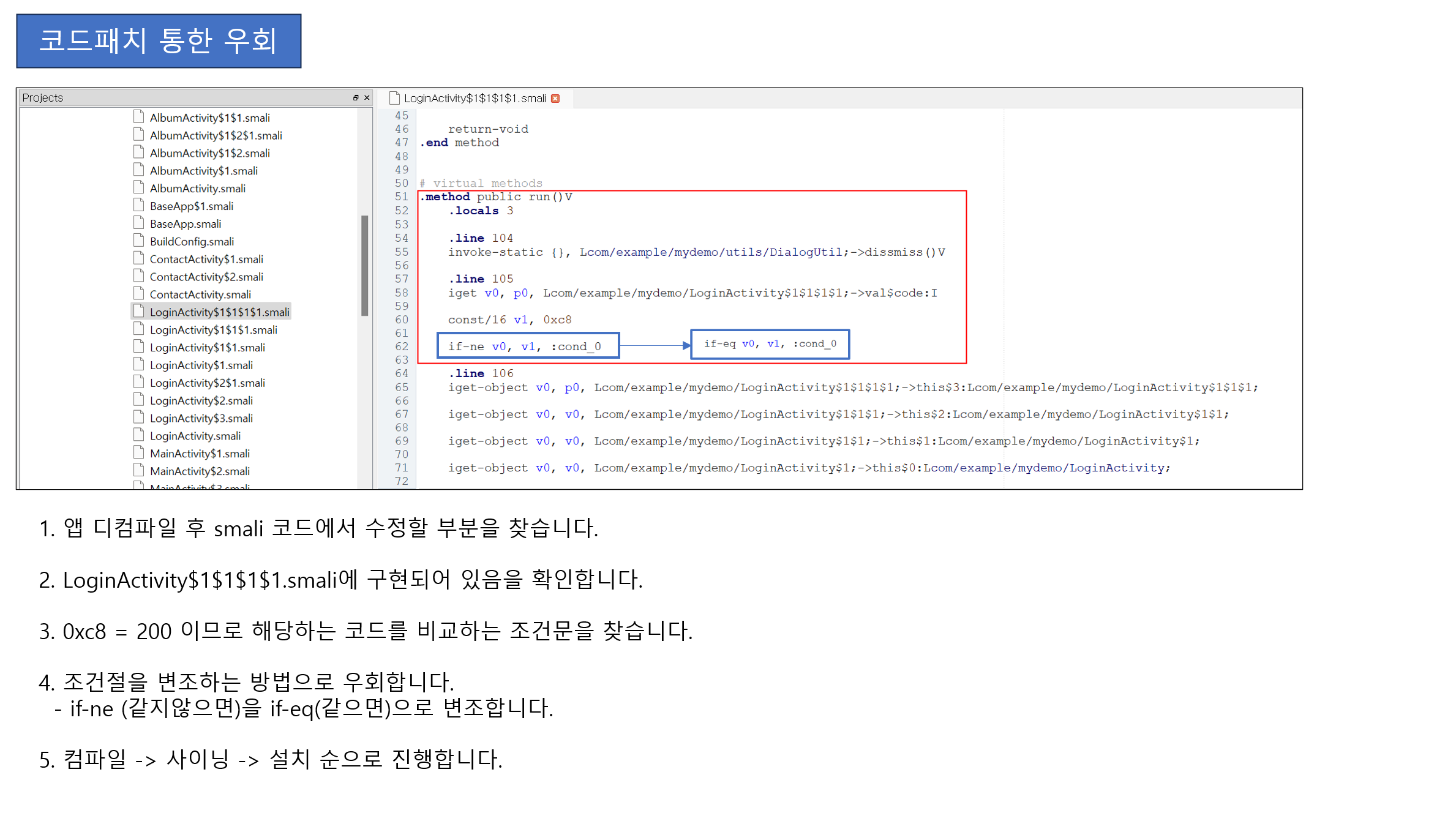 디컴파일로 앱 디컴파일 이후 smali 코드에서 수정할 코드를 찾는다. 이 경우 조건문 우회를 통해 코드패치를 적용하였다.