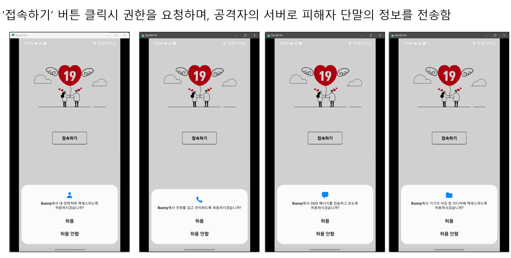 "접속하기" 버튼으로 진행하면 앱 현재 기능과 무관하게 권한을 요청하며, 악성행위가 진행된다.