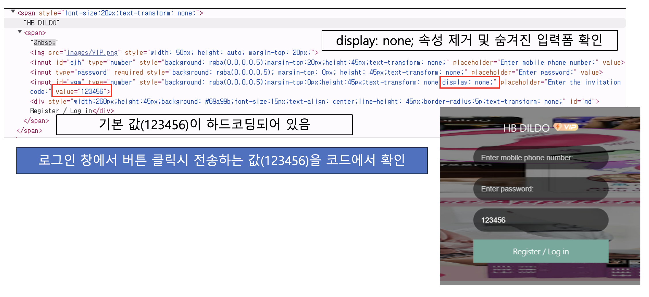 전송된 패킷에 포함된 임의 문자열 "123456"은 html 내 히든 속성으로 포함되어 있었다. 이 속성을 제거하면 기본 값으로 코딩된 값을 확인할 수 있다.