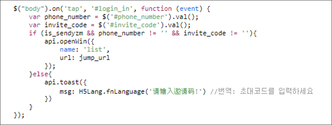 '로그인' 버튼 클릭시 호출되는 콜백함수를 분석하면 두 개의 입력폼(전화번호, 비밀번호)에 대한 사용자 입력 값을 저장하고 빈칸이 아닐 경우 새로운 창을 열도록 하고 있다. 서버의 응답으로 url(jump_url)가 전달되는데 서버가 동작중이 아니어서 확인할 수 없다. 따라서 확인가능한 범위에서 악성행위 위주로 분석한다.