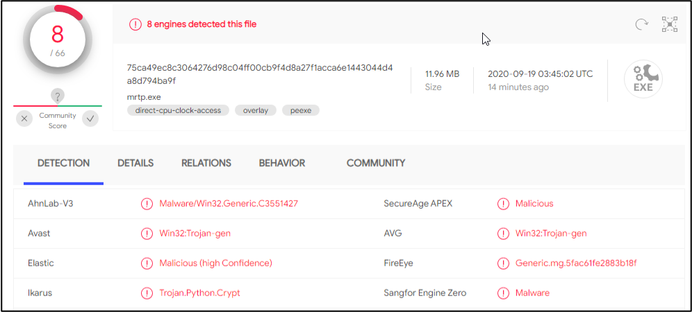바이러스 토탈에서 생성한 파일(mrtp.exe) 얼마나 많은 AV 엔진에서 진단하는지 확인