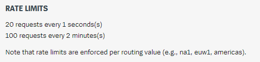 이제 검색할 소환사명을 등록한 후 LOL.nowgame()을 주기적으로 호출해주면 그사람이 게임중인지 아닌지 확인할 수 있다. 하지만 라이엇에서는 너무 잦은 API 호출을 막기 위해 요청 제한을 걸어두었다.