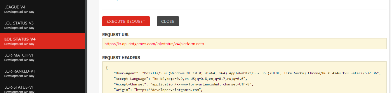 적절하게 API 키를 발급 받았다면 원하는 기능인 게임 알림 봇을 위해 API를 찾는다. API의 구조는 어느 공공 API를 사용하는 것과 같다. Request Header에 필요한 API-KEY와 필요한 정보를 채운 후 원하는 리소스가 있는 주소에 요청을 하면 반환값으로 데이터를 전달받을 수 있다. 데이터가 적절하게 넘어왔는지는 HTTP 상태 코드를 통해 확인할 수 있다. 응답은 모두 json 포맷으로 받을 수 있고 사용자가 파싱하여 원하는 데이터를 가져다가 쓰면 된다.