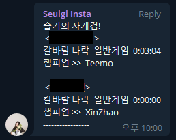 간단하게 작성한 스크립트지만 모든 기능이 속도도 느리지 않고 문제 없이 잘 동작한다. 물론 실제 게임 시간과 지연 없이 거의 비슷하게 일치한다. 공식 API를 지원하지 않았더라면 전적 사이트를 크롤링하거나 클라이언트를 후킹해야 했을 것이다. 다른 분들은 전적 데이터를 모아 학습시킨 후 실시간 랭크 승률 예측 까지 하는 것을 보았다. 본인의 역량과 시간이 허락한다면 충분히 해볼만한 프로젝트인 것 같다.