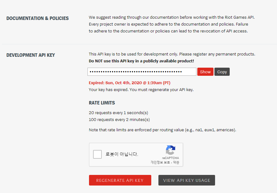 라이엇 계정이 있다면 개발자로 등록을 해서 개발 키(Development API KEY)를 발급받아서 자신만의 서비스에 결합할 수 있다. 물론 테스트 목적이라면 24시간 동안만 유효한 테스트용 API KEY를 이용해서 원하는 기능을 테스트해볼 수 있다.