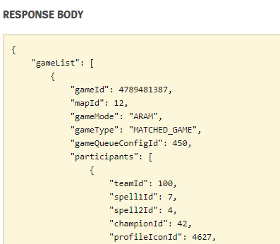적절하게 API 키를 발급 받았다면 원하는 기능인 게임 알림 봇을 위해 API를 찾는다. API의 구조는 어느 공공 API를 사용하는 것과 같다. Request Header에 필요한 API-KEY와 필요한 정보를 채운 후 원하는 리소스가 있는 주소에 요청을 하면 반환값으로 데이터를 전달받을 수 있다. 데이터가 적절하게 넘어왔는지는 HTTP 상태 코드를 통해 확인할 수 있다. 응답은 모두 json 포맷으로 받을 수 있고 사용자가 파싱하여 원하는 데이터를 가져다가 쓰면 된다.