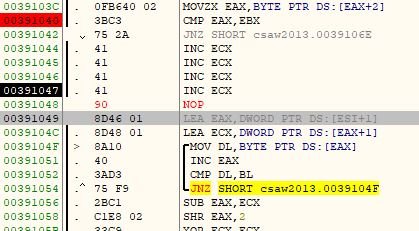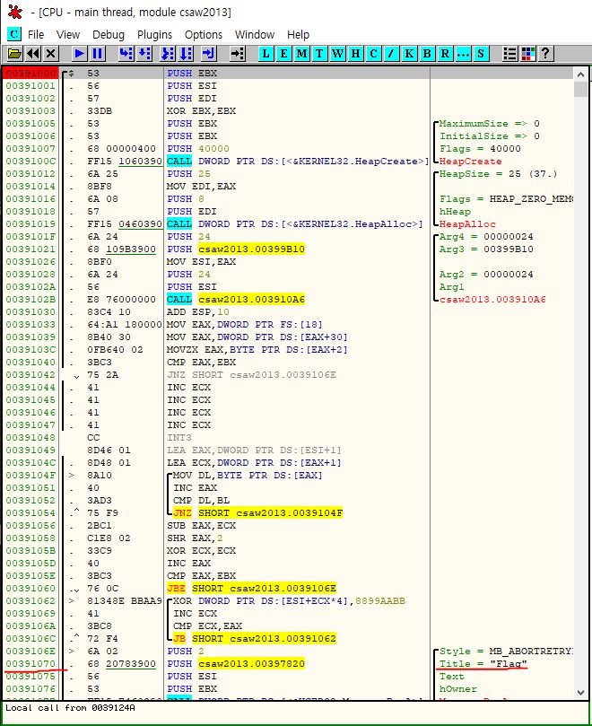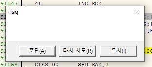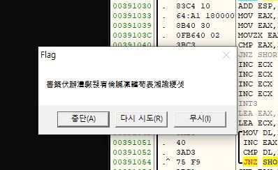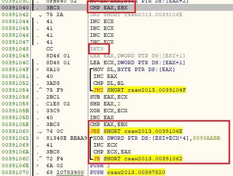 EAX와 EBX를 비교하는 분기문이 있고 인터럽트를 발생시키는 명령어인 INT3도 있습니다.