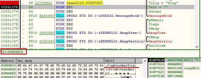 ESI 에 저장된 값을 불러오고 있는데 그 주소(030505C8)로 찾아가 보면(Ctrl + G) 시작값이 '00'인 flag 값을 찾을 수 있다.