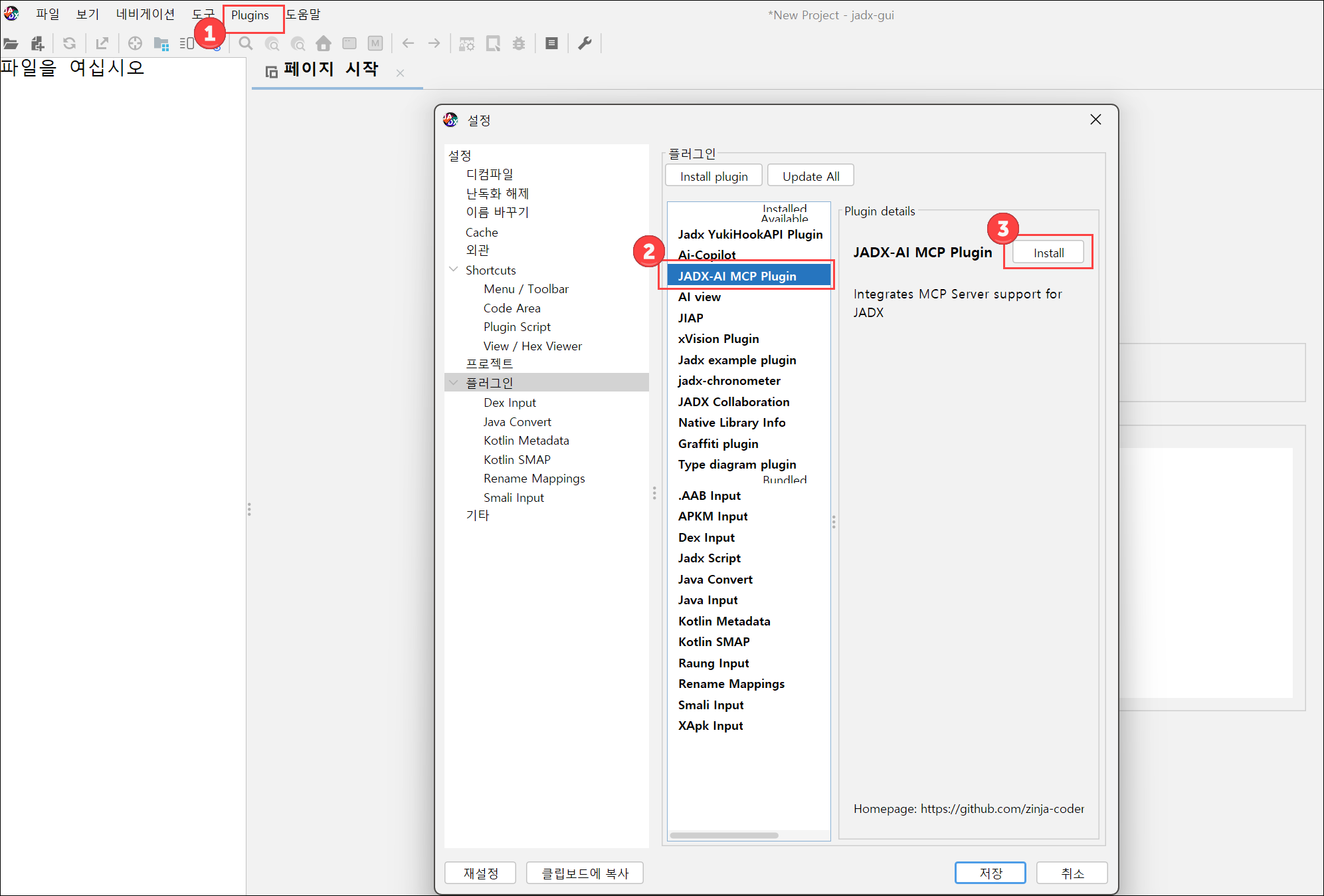 - jadx 실행하여 plugin으로도 설치 가능하다.