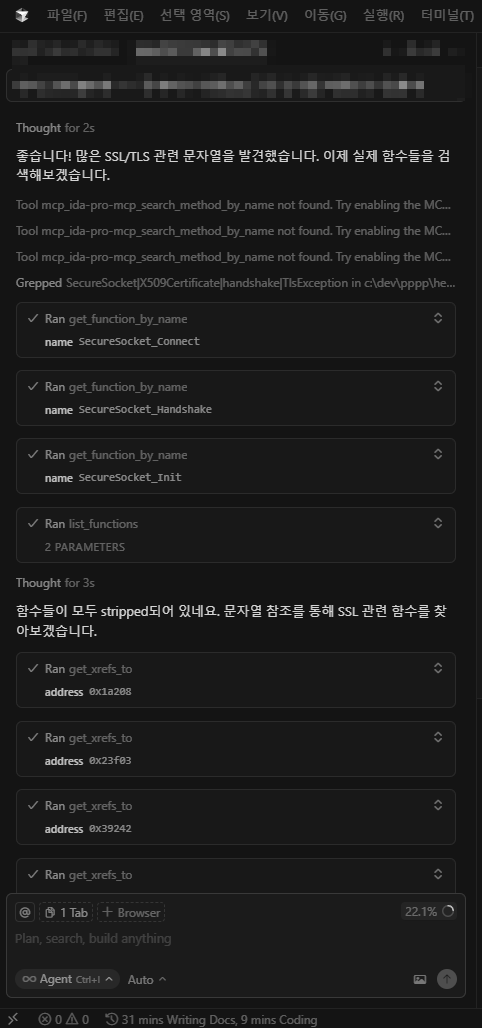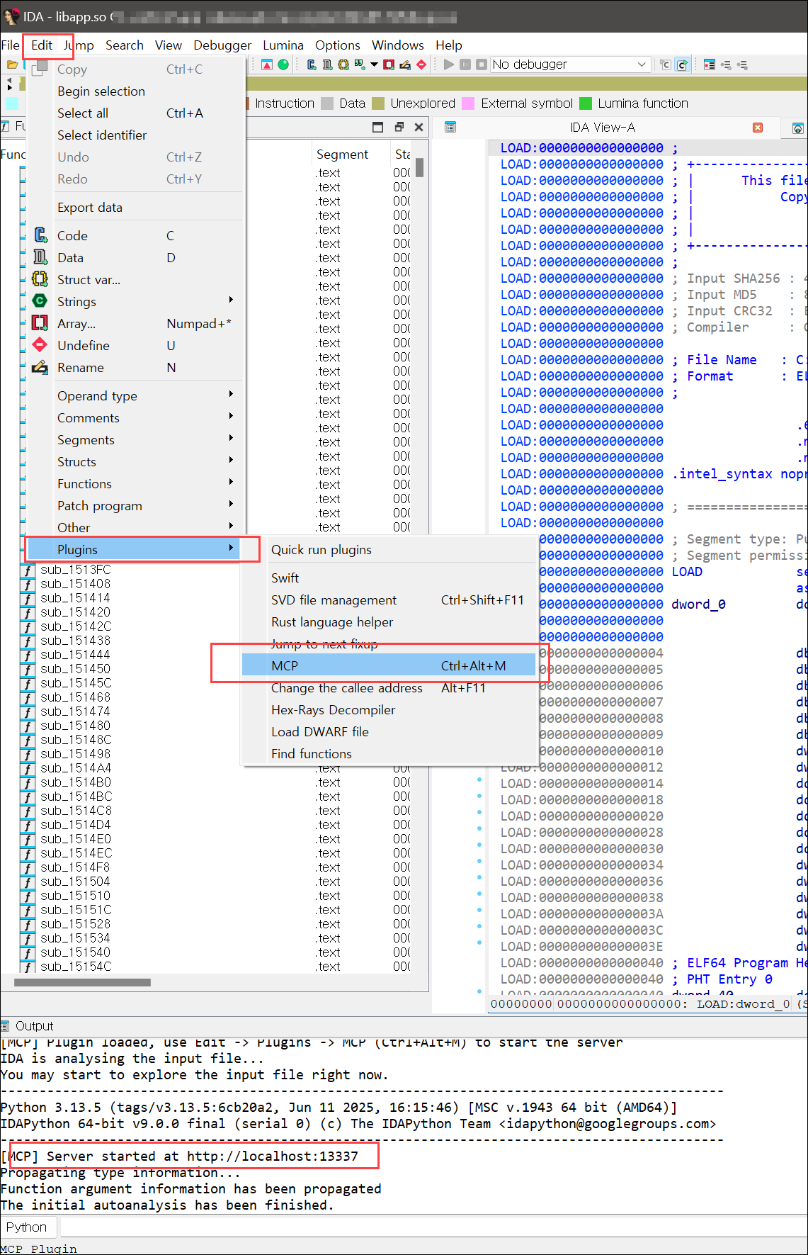 IDA - Edit - Plugin - MCP 선택하여 MCP 서버 실행을 확인한다.
