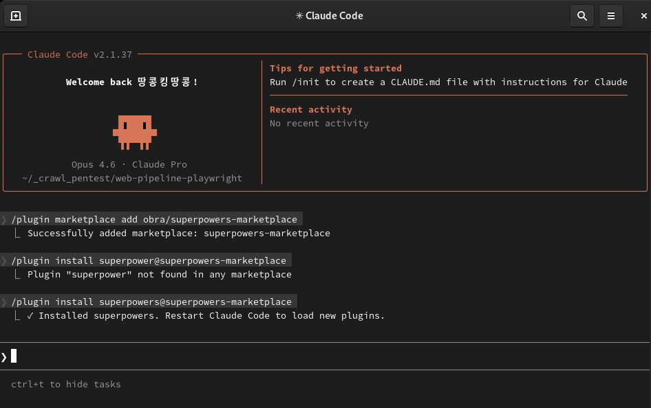 설치는 놀랍도록 간단하다. Claude Code를 실행하고 다음 명령어를 입력하면 된다: