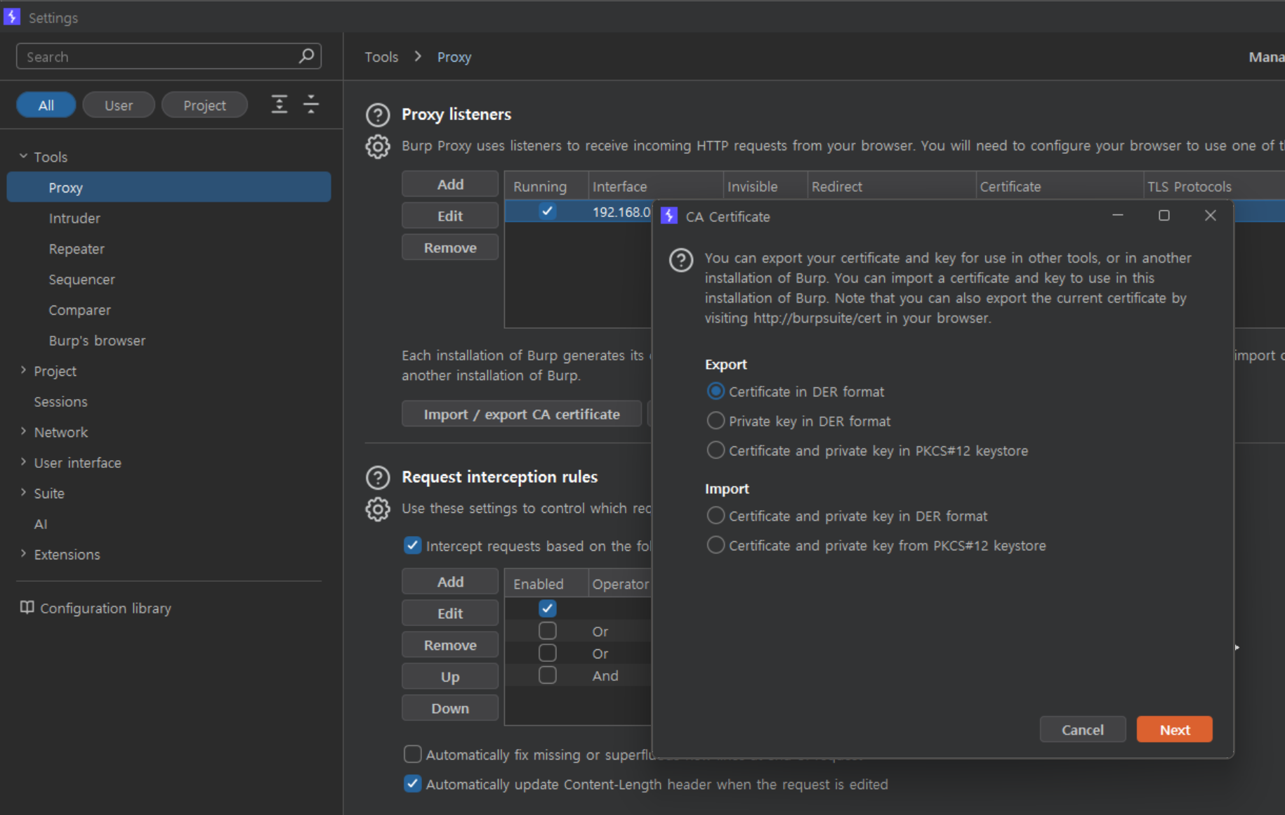 Proxy → Options → Import/export CA certificate → Certificate in DER format- 또는 프록시 설정 후 브라우저에서