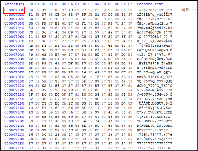 재작성된 DLL의 모습을 보면 PE파일의 헤더의 형태와, 랜섬웨어 감염 이후 보이던 문자열들을 확인할 수 있다.