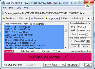 PE 정적 분석 도구로 보았을 때 "알려진" 패커 중에서는 사용된 것이 없다는 것을 확인할 수 있다. 각 섹션의 영역의 주소와 사이즈가 일반적인 PE파일과 유사하다.