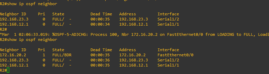 이웃에 위치한 라우터의 주소, 우선순위(Pri), 상태(State), 무응답시간(Dead Time), 연결된 인터페이스 정보 등을 확인할 수 있다. 아래에 보면 172.16.20.2 단말이 BDR로 선언되어 동작중인 것을 확인할 수 있다.