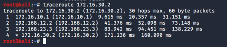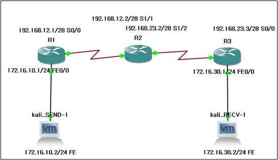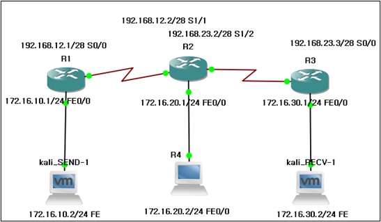 다음은 호스트 단말(kali_SEND)에서 목적지(kali_RECV)로 경로추적 명령을 통해 라우팅이 잘 이루어지고 있는지 확인해 본다.
