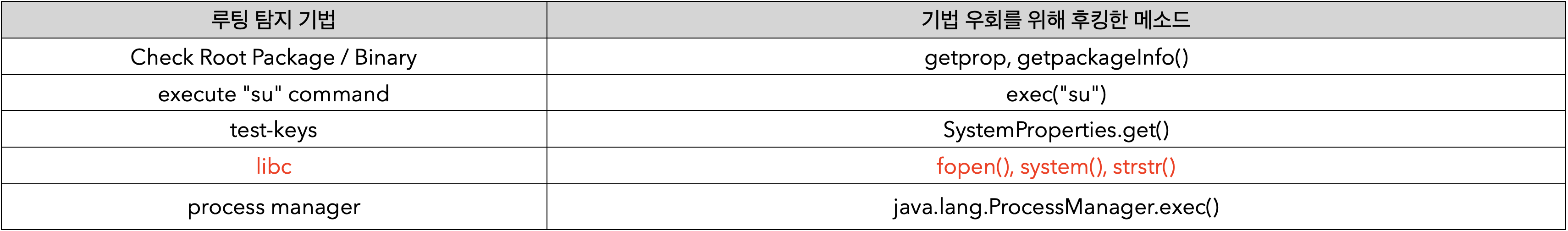 앱 리소스 보안을 위해 보안 솔루션을 적용한 경우 java레벨의 난독화와 최소화(mininalize)를 통해 어떤 메소드가 실행되는지 정적 분석을 통해 알 수 없다. 그렇기 때문에 시스템에 더 가까운 Native 함수를 후킹하여 루팅 패키지 검사, 시스템 권한 필요 명령어("su") 실행 등을 후킹한다.