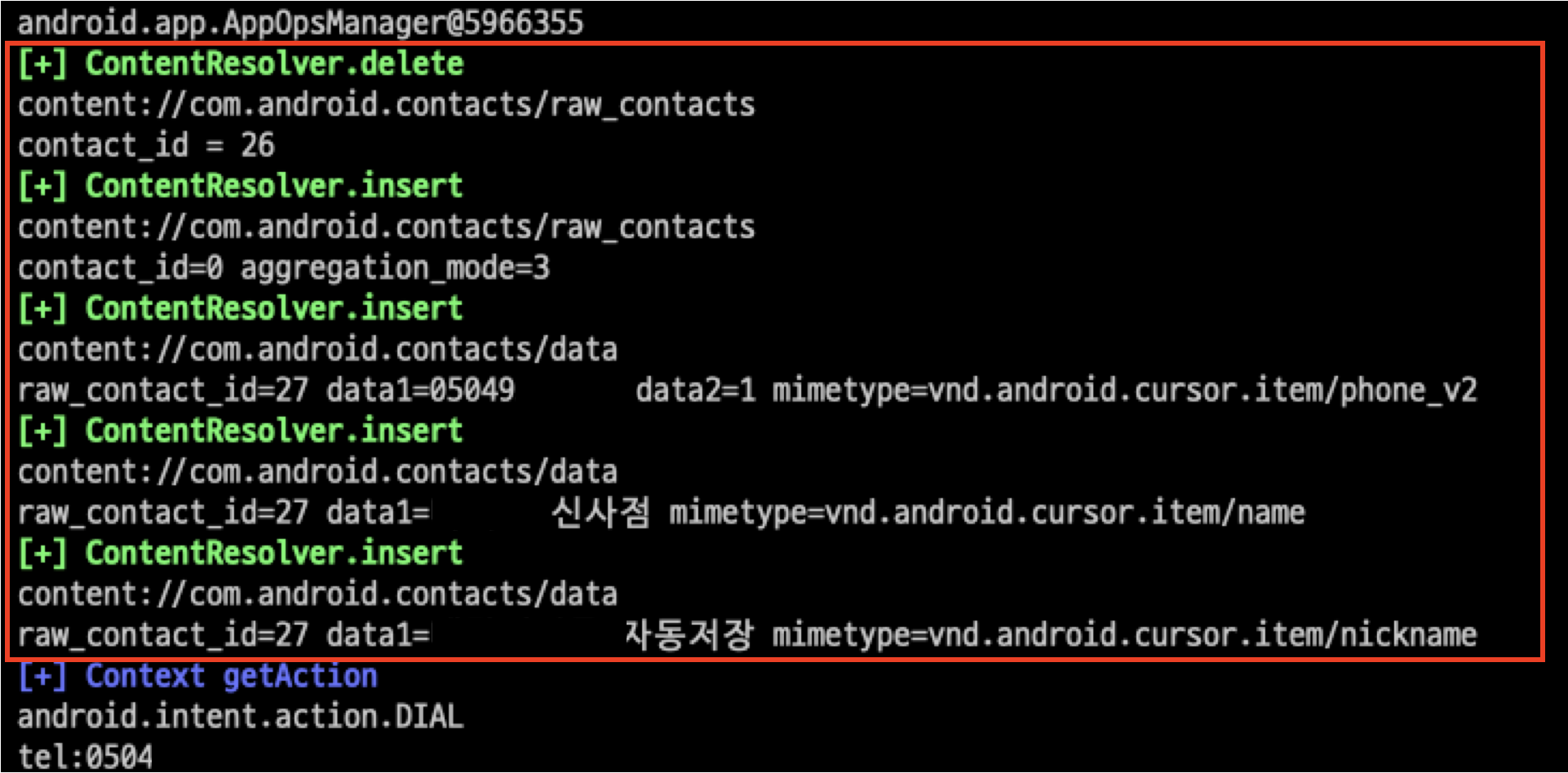 연락처에 접근하여 전화번호를 저장, 수정, 삭제하려는 시도가 있을 때 후킹되는 함수이다. 자세한 데이터 포맷은 로그를 분석하면 쉽게 알 수 있다. 사진은 연락처 "추가"를 시도할 때의 모습이다.