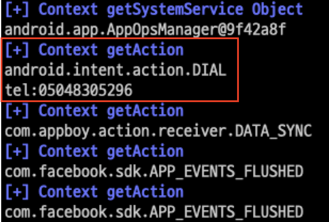 로그에서 알 수 있듯 전화걸기 뿐만 아니라 Intent를 통하 데이터를 전송하는 다른 정보들 까지 확인 할 수 있는 것을 알 수 있다.