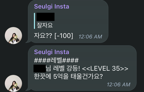 새로운 게시글 알림 봇, Open API를 이용한 업데이트 등 다양한 기능을 할 수 있는 텔레그램 봇을 여러 개 운영하고 있다. 봇을 더 사용자 친화적으로 사용할 수 있는 방법이 없을까 고민하던 중 메시지마다 경험치를 부여하여 채팅을 할수록 레벨업을 하는 기능을 구현해 보았다. 단체 채팅방에서 사용하면 재미있는 기능이며, 텔레그램 메시지 핸들러 사용을 위한 python과 서버 구축을 위한 MySQL을 통해 구현하였다.