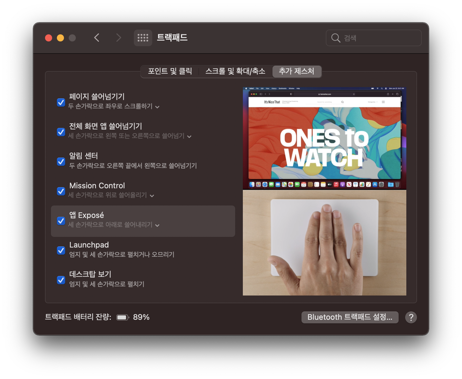 두 손가락으로 쓸어넘기기, 세손가락으로 넘기기, 오므리기, 펼치기 등 손가락으로 할 수 있는 모든 동작을 트랙패드에 담아놓았다. 사용자가 원하는 기능을 할당할 수도 있으며 기본 설정된 동작들 또한 직관적으로 알 수 있게 해 두어서 사용하기에 무리가 없다.