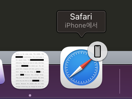 아이폰에서 사파리나 기본앱을 사용하다가 노트북으로 작업을 하고 싶을 때 맥에서는 미리 준비해 놓았다는 듯 독(Dock)의 아이콘에서 작업 정보를 띄워놓을 준비를 하고 있다. (Hand Off 기능)