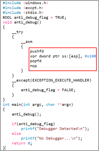 EFLAGS를 바로 변경하는 명령어는 없기 때문에 PUSHFD를 통해 모든 플래그를 PUSH 한후 0x100을 xor연산한다. 이는 9번째 비트를 SET 시키기 위함이다. 연산 완료 후 POPFD를 통해 TF 값을 다시 EFLAGS에 저장한다.