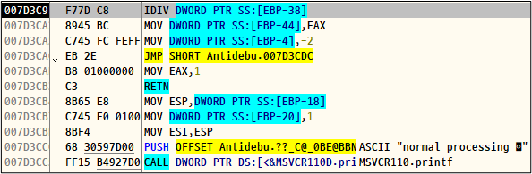 예외가 발생하게 되면 SEH_FLAG가 세팅된다. 기법의 우회는 올리디버거에서 Shift+F7/F8/F9를 통해 예외의 처리를 시스템에 넘겨주거나 함수가 참조하는 구조체의 값을 직접 변경한다.