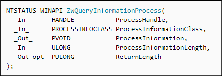 현재 동작 중인 프로세스에 대한 다양한 정보를 구할 수 있는 시스템 함수이다. 정보를 얻을 프로세스 핸들, 디버그 포트 등 원하는 시스템 정보를 주고 호출하면 디버깅여부를 확인할 수 있는 리턴값을 반환한다. 이 반환값을 0으로 변경을 통해서도 안티 디버깅의 우회가 가능하다.