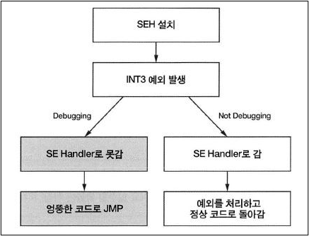 예외(exception)를 이용하는 안티디버깅 기법이다. 프로세스에서 예외가 발생하면 OS가 예외를 받아서 프로세스에 등록된 SEH를 호출한다. 하지만 디버기에서 예외가 발생하면 디버거에서 예외를 처리한다는 점을 이용한다.