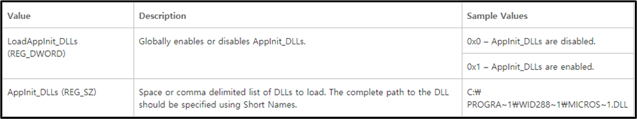 - AppInit_DLLs 항목에 인젝션할 DLL 경로 문자열을 입력한다.