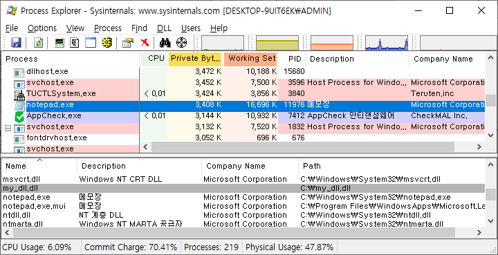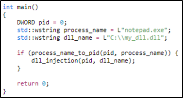 메모장(notepad.exe)가 실행 중일 때 pid를 찾아서 변수로할당하고, 후킹할 dll의 경로를 주어 injection이 동작하도록 한다.