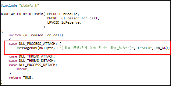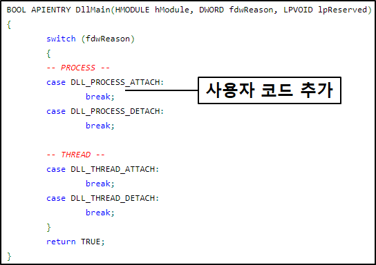 - DllMain()에 코드를 추가하여 원하는 동작을 수행한다.