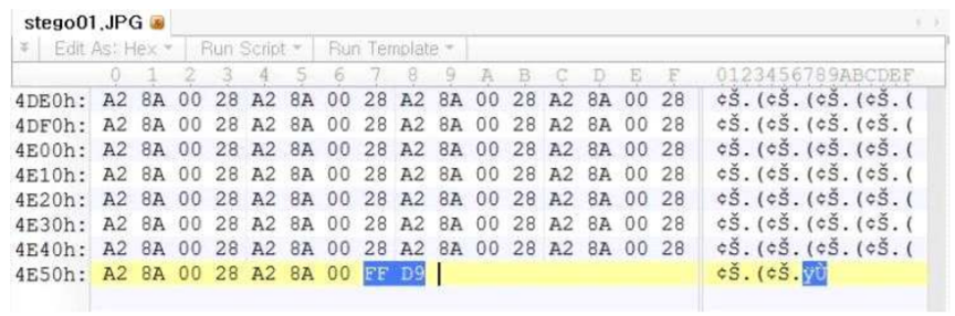 JPEG, PNG, GIF 등의 파일에는 파일의 끝을 알리는 EOI 바이트가 존재하는데, EOI 바이트 뒤의 데이터는 무시되기 때문에 해당 위치에 데이터를 은닉할 수 있다.